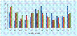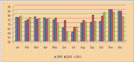 Rainfall : Karaikal has an annual average rainfall of about 126 cm. 68 percent of which occurs during October to December. The amount of rainfall during the south-west monsoon period is small, being less than 20 per cent of the annual rainfall. November is the rainiest month, accounting for about a third of the annual total. The range of variation of annual rainfall is wide. Variability of annual rain fall is fairly large, so that significant variations in rain fall from year to year may be expected. Drought conditions with the annual rainfall of less than 75 per cent of the normal may be expected once in three years on an average. In a year there are on an average about 55 rainy days, ie. Days with rainfall of 2.5 mm. or more.