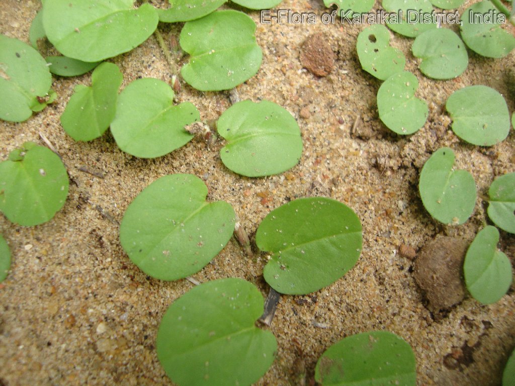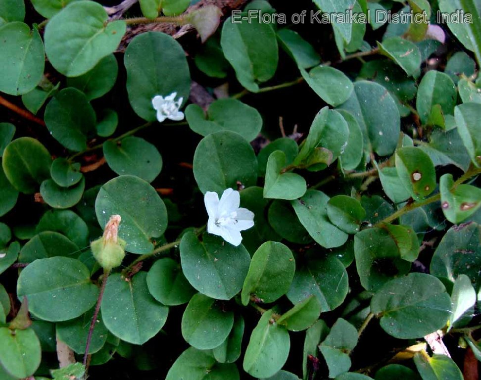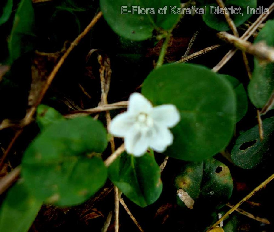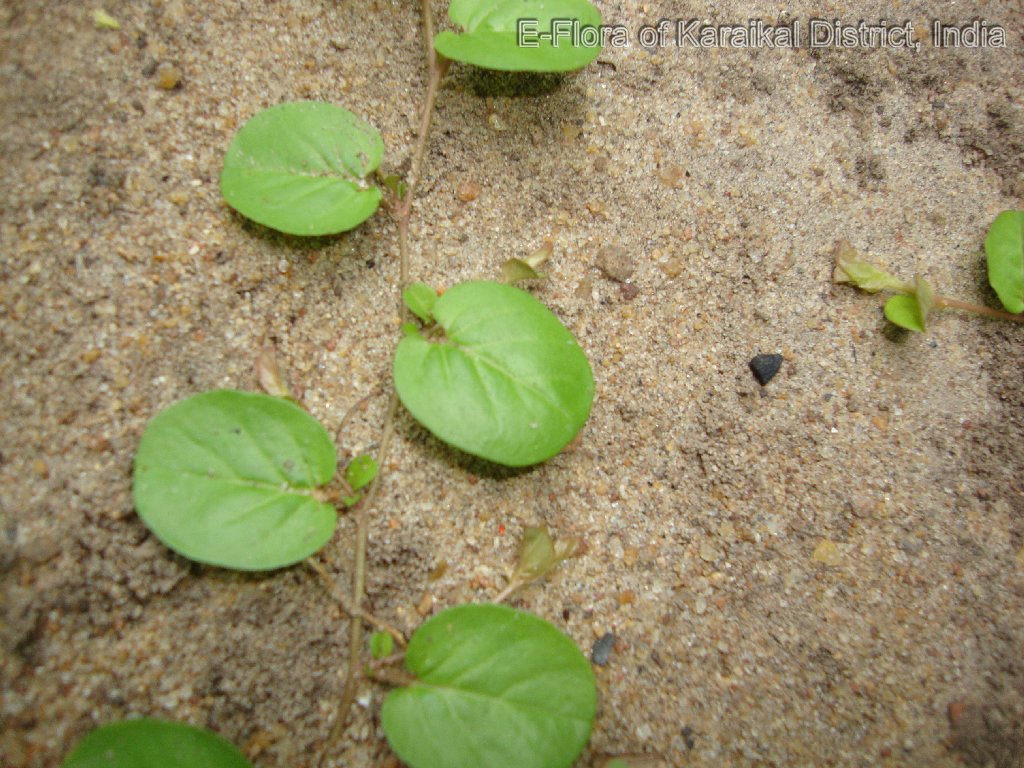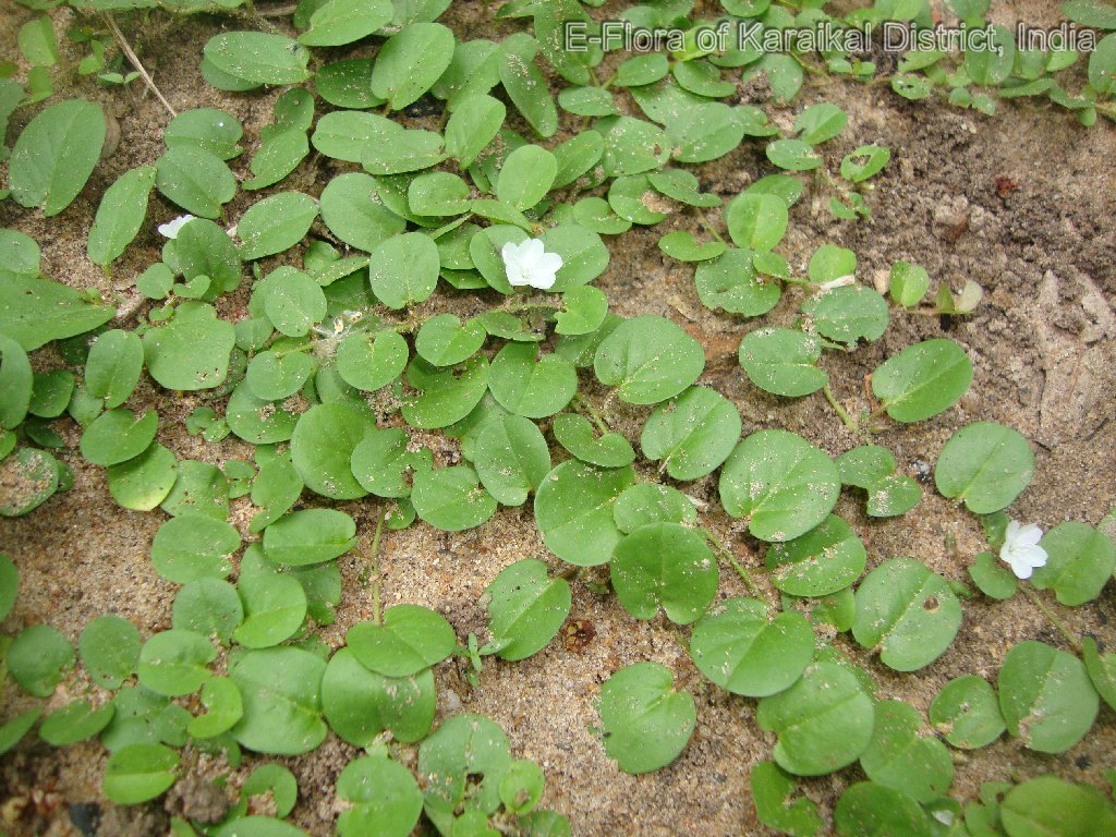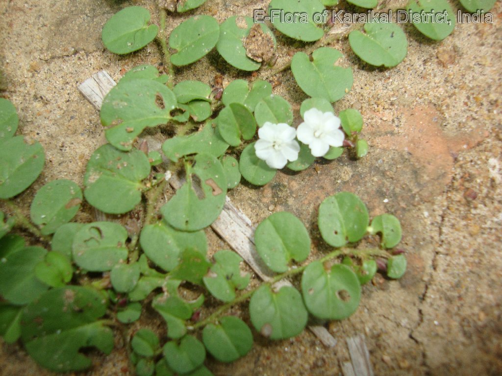 Prostrate herb; stem rooting at lower node, slender, sericeous. Leaves alternate, ovate-orbicular, 07 - 09 x 08 - 13 mm, cordate at base, entire at margin, obtuse-retuse at apex, glabrescent, central nerves hairy beneath; 4-pairs beneath; petiole, up to 04 mm long, hairy. Flowers ca. 07 mm across, white, solitary, axillary, 1 - 3-flowered; pedicel 02 mm long. Calyx-lobe 5, imbricate, lobe oblong 3.2 mm long, ciliate at margin, shortely apiculate at apex. Corolla funnalform-rotate, tube 04 mm long; limp emarginate, white hairy upper furface. Stamens 5; filament filiform, 02 mm long; anther oblong-sagittate, 0.5 mm long. Ovary ovoid, 4-lobed, 01 mm across, glabrous; 4-locule; ovules 4; style 2, branching distinct, filiform, 4.5 mm long, glabrous; stigma minute, sessile. Capsules globose, 4-valved, 03 mm across, shorter than calyx; seeds 2 - 4. rarely 3, ovoid, slightly, triqutrous, minutely tuberculate, pinkish often brown.